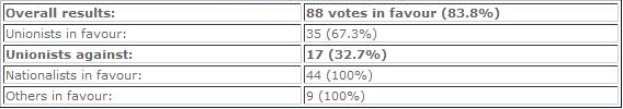 Out of the 105 votes cast, a total of 88 were in support of the move, with only the UUP voting against.