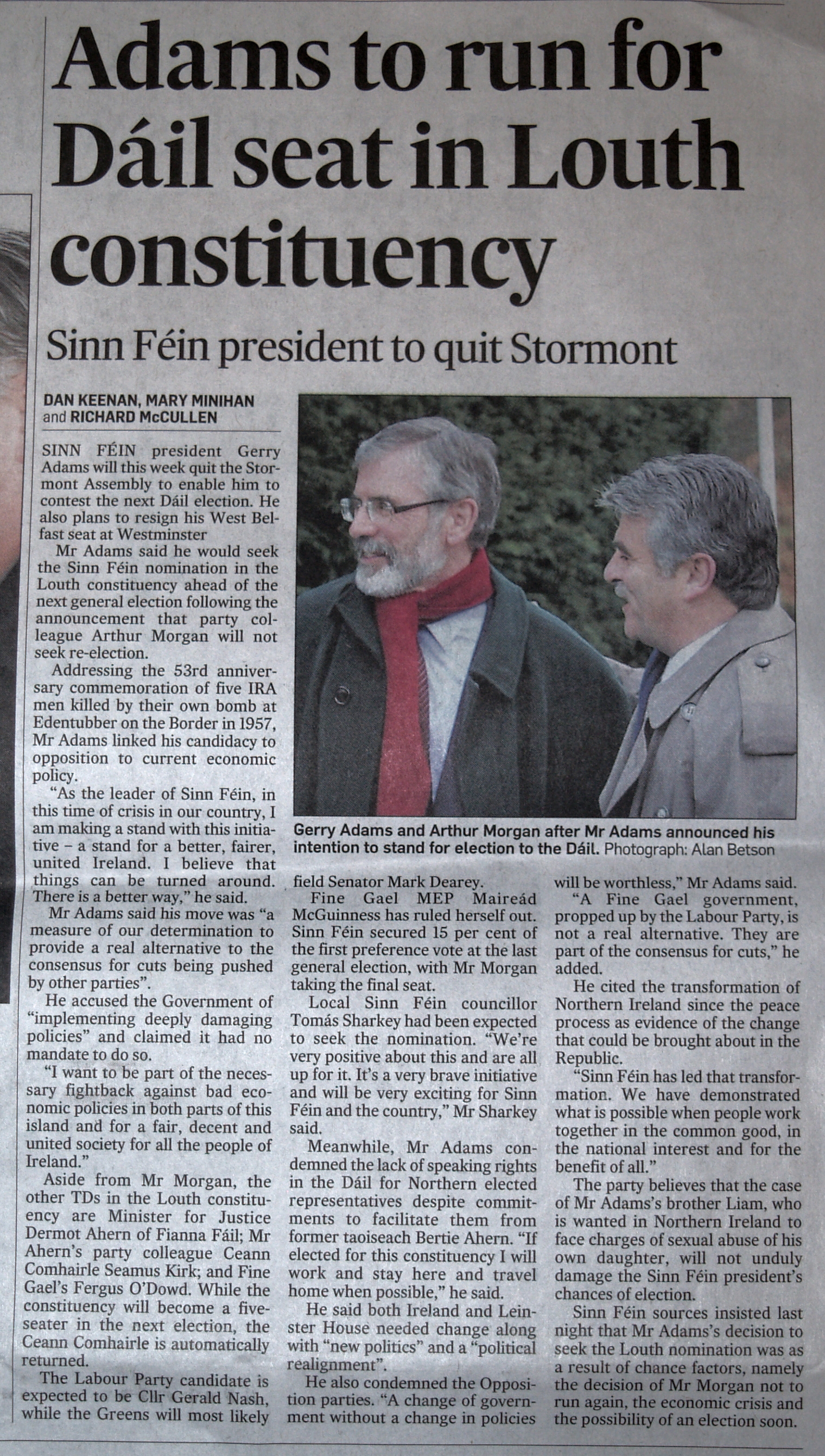Ufficializzata dallo stesso leader dello Sinn Fein L’abbandono dela carica di parlamentare e membro dell’Assembly per concorrere alle elezioni nella Repubblica di Irlanda