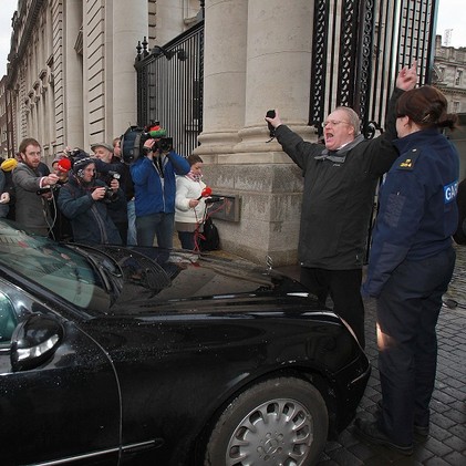 Un manifestante cerca di bloccare l'auto del ministro Mary Hanafin all'ingresso del Palazzo del Governo di Dublino