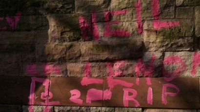 La scritta “Lennon RIP” è apparsa su di una pareta della cappella di St Matthew’s in Strand Road a East Belfast. A fianco del graffito è stato disegnato anche un impiccato.