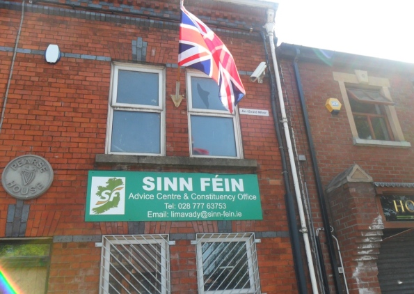 Disprezzo dei membri dell’ufficio dello Sinn Fein Limavady, per l’attacco ‘anti-democratico’ subito con l’imposizione della Union Jack sopra l’ufficio del partito e con lo sfregio dei manifesti elettorali affissi in città