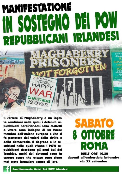 Così come altre città in Europa, sabato 8 ottobre alle ore 10.30 Roma si raccoglierà in Via XX Settembre per manifestare il proprio supporto ai pows irlandesi e per chiedere la fine dell’internamento senza processo che ha portato recentemente dietro alle sbarre la leader del 32 County Soverignity Movement, Marian Price e Martin Corey