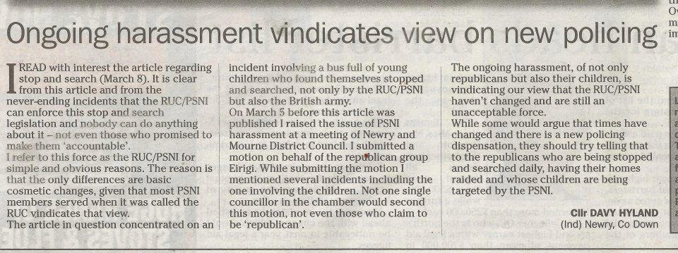 Lettera del consigliere Davy Hyland ad un quotidiano, sulle incessanti molestie di cui sono vittime numerosi cittadini repubblicani a Newry