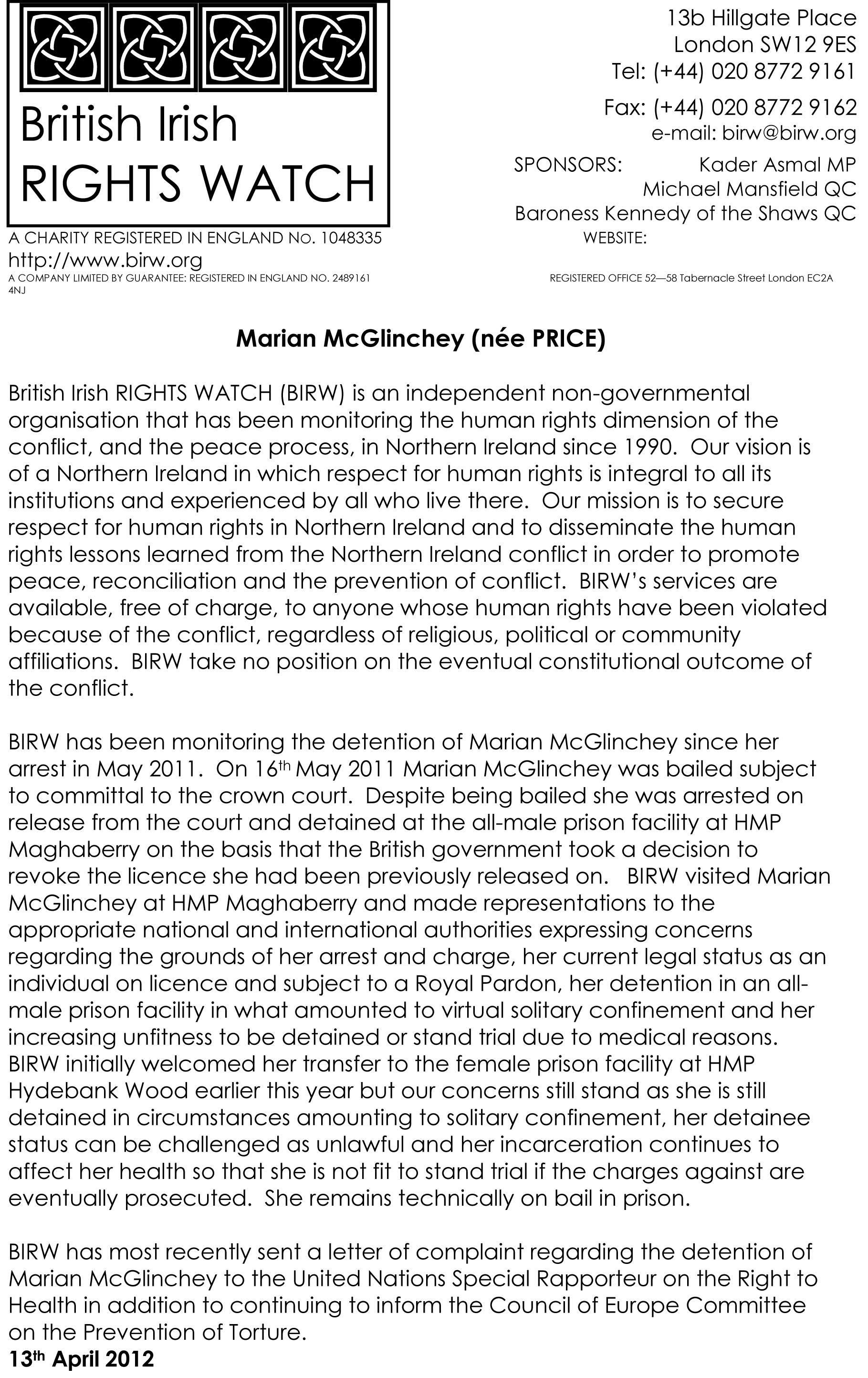 Il BIRW è un’organizzazione indipendente non governativa che dal 1990 monitora l’aspetto dei diritti umani nel conflitto e nel processo di pace in Irlanda del Nord. L’organizzazione ha recentemente inviato una lettera al United Nations Special Rapporteur on the Right to Health e al Consiglio del Comitato Europeo sulla Prevenzione delle Torture, portando alla loro attenzione le proprie preoccupazioni per le precarie condizioni di Marian Price