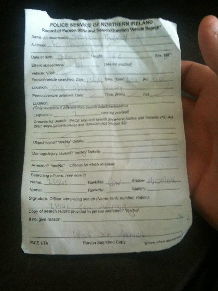 Stop and Search – Denuncia al Police Ombudsman Posted on 20 Apr 2012 by S.P. Lascia un commento Denuncia di Stop and Search al Police Ombudsman Denuncia di Stop and Search al Police Ombudsman Condividi su Facebook (Si apre in una nuova finestra) Facebook Condividi su X (Si apre in una nuova finestra) X Invia un link a un amico via e-mail (Si apre in una nuova finestra) E-mail Stampa (Si apre in una nuova finestra) Stampa Altro Condividi su WhatsApp (Si apre in una nuova finestra) WhatsApp Condividi su LinkedIn (Si apre in una nuova finestra) LinkedIn Condividi su Reddit (Si apre in una nuova finestra) Reddit Mi piace Caricamento... Precedente Continua Return to CREGGAN ACCUSA LA PSNI DI MOLESTIE