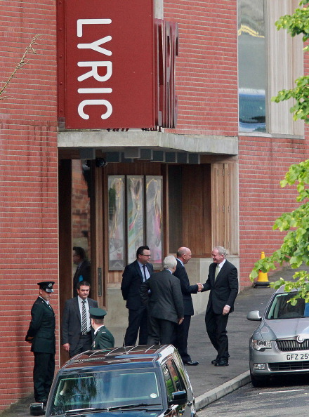 Northern Ireland’s Deputy First Minister Martin McGuinness (R) arrives at the Lyric Theatre in Belfast, Northern Ireland on June 27, 2012. Queen Elizabeth II shook hands with former IRA commander Martin McGuinness on Wednesday in a landmark moment in the Northern Ireland peace process, Buckingham Palace said. The initial handshake between the queen and McGuinness, who is now deputy first minister of the British province, took place away from the media spotlight behind closed doors in Belfast’s Lyric theatre. AFP PHOTO / PETER MUHLY (Photo credit should read PETER MUHLY/AFP/GettyImages)