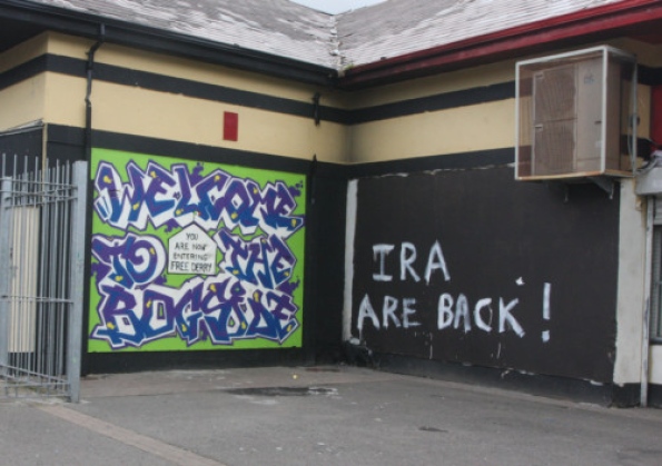 Dopo l’annuncio di riunificazione da parte di un nuovo “Army Council” dell’IRA, nel Bogside sono apparsi graffiti in sostegno alla formazione dissidente Repubblicana che comprende Real IRA, RAAD e un terzo gruppo