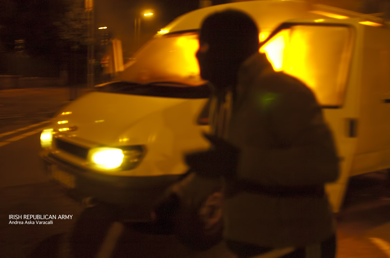 Veicoli dati alle fiamme nella notte a North Belfast. Sulla scena ha fatto la sua comparsa l’IRA. Pattuglie della PSNI si sono mantenute ad una distanza di sicurezza, senza intervenire. Lo scatto fotografico di Andrea Varacalli