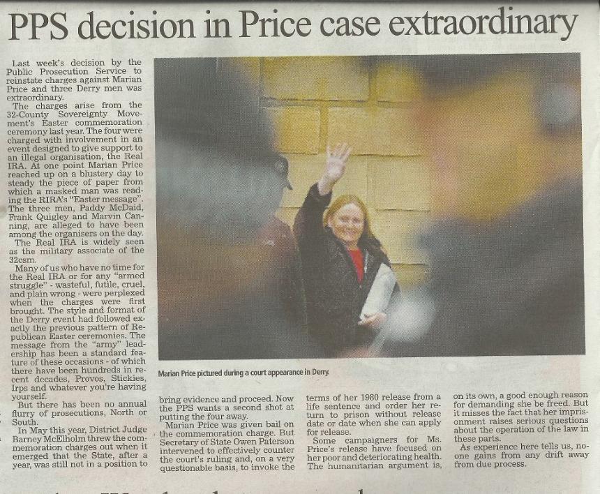 L’Irish Times torna ad occuparsi dell’internamento di Marian Price, caso che sta scuotendo sempre maggiori perplessità dopo l’ennesima svolta, quando la settimana scorsa il PPS ha ripristinato le accuse originarie