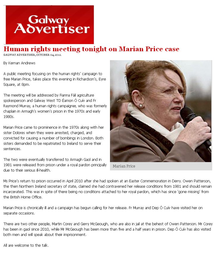 TAPPA A GALWAY PER LA CAMPAGNA DI LIBERAZIONE DI MARIAN PRICE