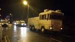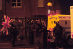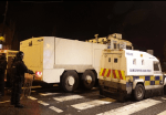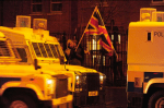 Squadre antisommossa della PSNI massicciamente schierate in Bryson Street, dove si sono avuti lanci di molotov negli scontri che sono divampati nuovamente questa sera.