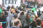 Davanti al Free Derry Wall, su cui campeggia da ieri pomeriggio la scritta “Ding dong the witch is dead”, un folto gruppo di persone si è riunito con le bandiere irlandesi, e i tricolori sventolavano fuori dai finestrini delle auto di passaggio.
