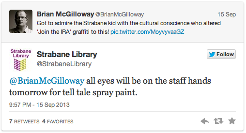 “Ammirate il ragazzo di Strabane che con la sua coscienza culturare ha alterato il graffito ‘Join the IRA’ in questo”, ha postato McGilloway sul social network.