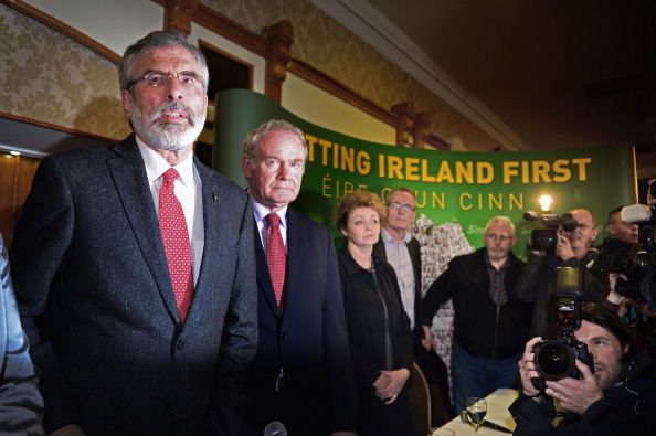 BELFAST, NORTHERN IRELAND – MAY 04: Sinn Fein Leader Gerry Adams (L) speaks alongside Deputy First Minister of Northern Ireland, Martin McGuinness, during a press conference at Balmoral Hotel after he was released from Antrim PSNI Station without charge following questioning over the Jean McConville murder, on May 4, 2014 in Belfast, Northern Ireland. (Photo by Jeff J Mitchell/Getty Images)