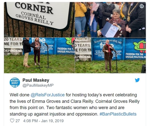Circa 200 persone, tra cui Paul Maskey, MP di West Belfast, Gerry Adams leader storico dello Sinn Fein e il sindaco Deirdre Hargey, si sono riunite ieri 19 gennaio per la cerimonia ufficiale di inaugurazione del Groves Reilly Corner.