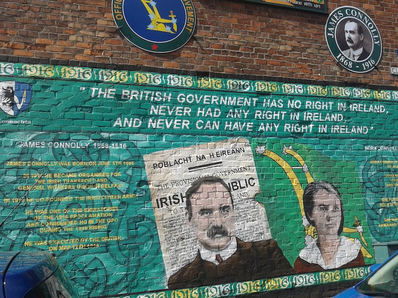 “Il governo inglese non ha nessun diritto in Irlanda, non ha mai avuto nessun diritto in Irlanda, e non potrà mai avere alcun diritto in Irlanda” James Connolly, eroe repubblicano socialista in primo piano, a sinistra, la figlia Nora, sullo sfondo, la proclamazione della repubblica Irlandese di cui fù un firmatario, e le starry Plough simbolo del repubblicanesimo socialista.