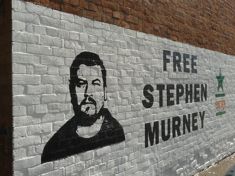Murales contro la detenzione di Stephen Murney, attivista di Eirigi, accusato senza prove concrete di aggressione.