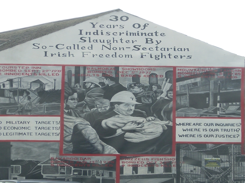 Questo murales elenca le stragi repubblicane, verso obbiettivi, apparentemente senza nessuna importanza strategica, elencandone le vittime innocenti, si pone il dubbio sul movente settario delle stragi. La scritta a destra,denuncia la mancanza di giustizia per le vittime e i loro familiari.