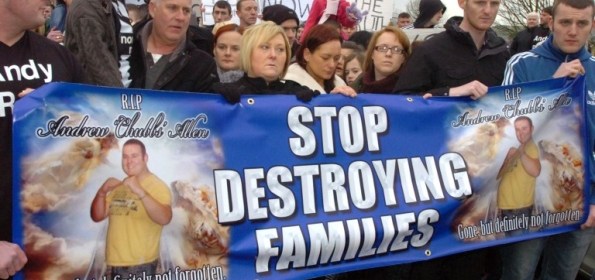 Centinaia di persone al fianco della famiglia di Andrew Allen, il ventiquattrenne di Derry ucciso in Donegal La famiglia di Andrew Allen qualche giorno fa ha lanciato un appello perché non ci siano vendette o ritorsioni in seguito all’omicidio, per cui si sospetta il RAAD (Republican Action Against Drugs), ma oggi pomeriggio era in testa ad un corteo affiancata dalla