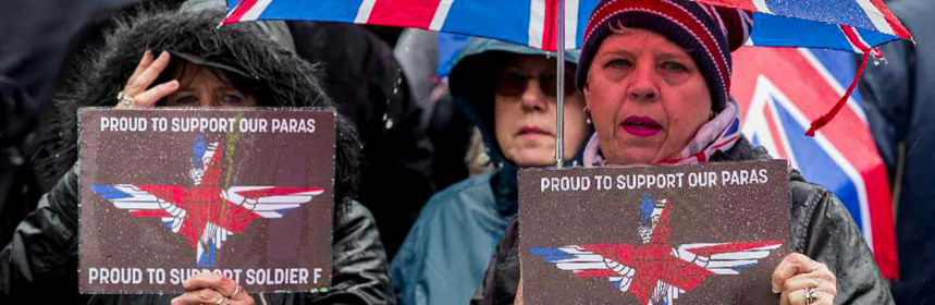 Un gruppo di sostenitori del “Soldato F”, l’unico incriminato per la Bloody Sunday, si è riunito intorno alle 12 di oggi (27 aprile) davanti al City Hall di Belfast. I veterani: “Fermeremo il Paese”. Contro-protesta dei  rappresentanti della Ballymurphy Massacre Campaign Dopo la protesta dei bikers, che era avvenuta in contemporanea a Londra e a Belfast, i sostenitori del “Soldato