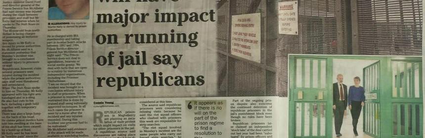 L’Irish News nel suo speciale, conferma le ferite inflitte al prigioniero Martin Kelly sbugiardando le dichiarazioni fornite da Sue McAllister e David Ford. Trova anche spazio il resoconto di un colloquio avuto con Harry Fitz, prigioniero detenuto nell’ala Roe 4 di Maghaberry. Harry afferma chiaramente che i prigionieri non stanno cercando di prendere controllo dell’ala, ma vogliono semplicemente muoversi liberamente e non dover sottostare al regime