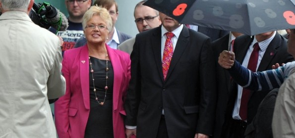 Willie Frazer e Jim Dowson  tra la folla di lealisti che hanno offerto il proprio supporto a Ruth Patterson, assessore DUP ed ex  vice sindaco di Belfast Ruth Patterson, si è presentata in aula per perorare la propria innocenza. La  Patterson era stato arrestato dalla PSNI dopo i commenti scritti su Facebook in risposta alla falsa notizia di un massacro